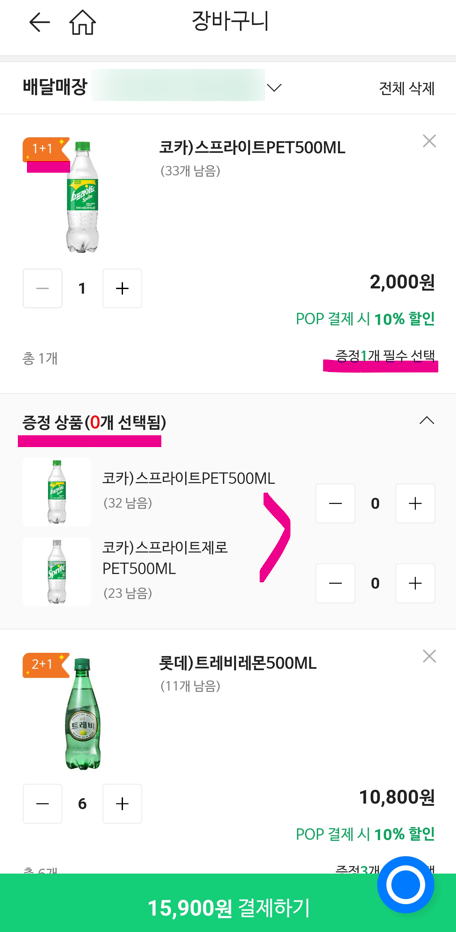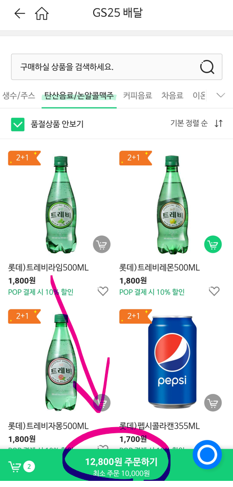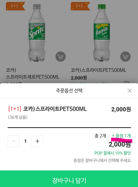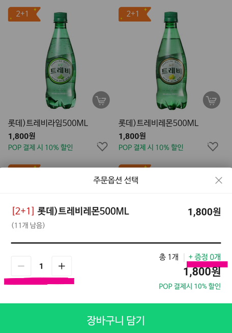2개를 담아야지 증정 1개가 따로 표시되는건