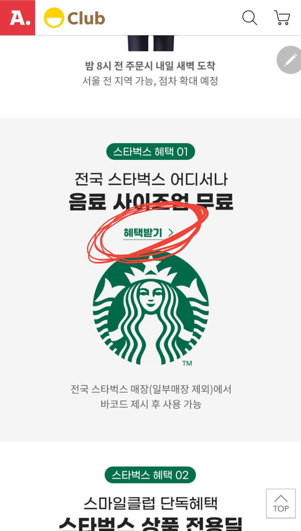 스마일클럽 스타벅스 혜택이라는 내용이 나올때까지 내려서