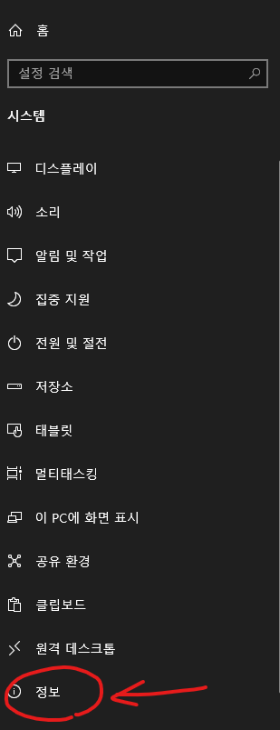 왼쪽 메뉴에서 가장 아래에 있는 정보를 눌러주면