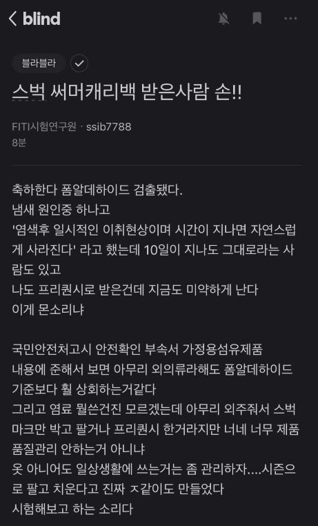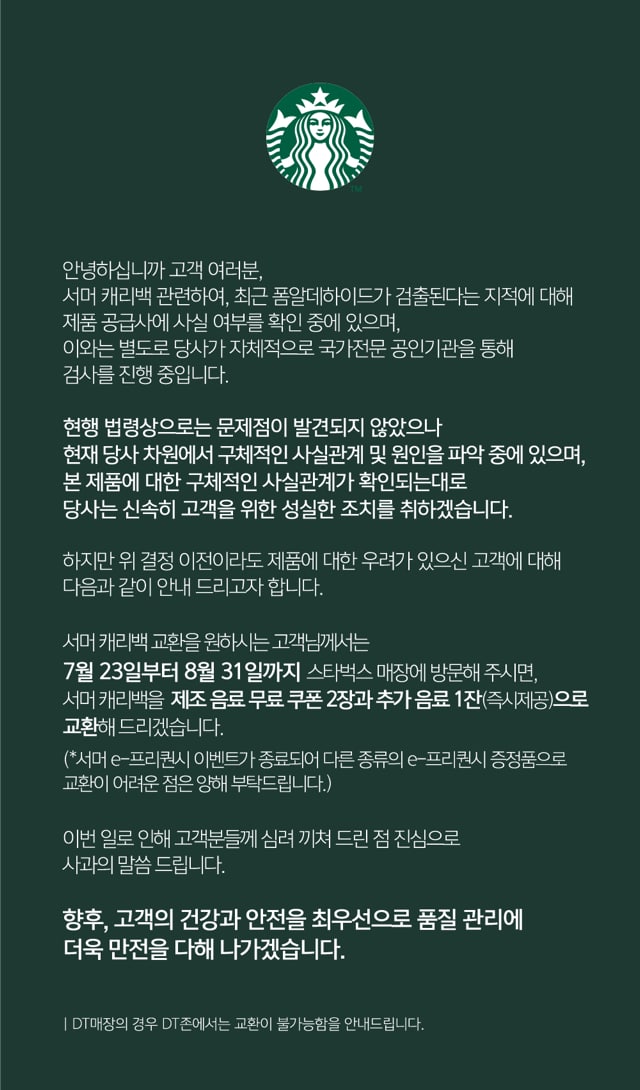 스타벅스 서머캐리백에서 포름알데히드가 검출된건지 파악중이다