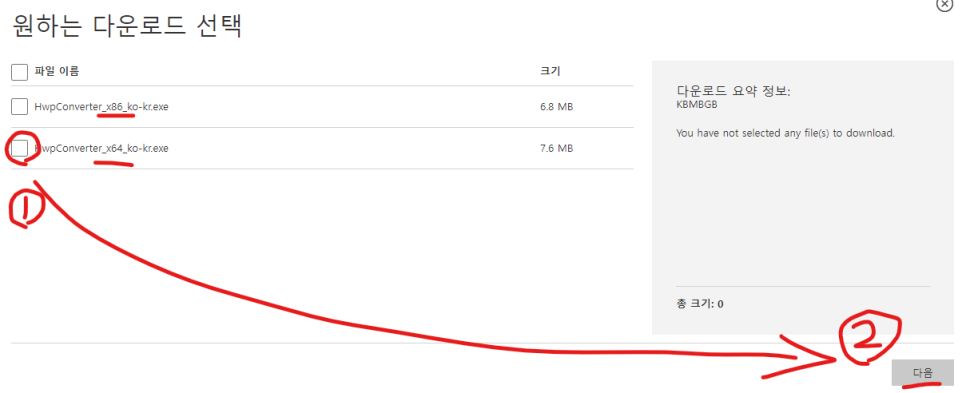 아래에 HwpConverter_x64_ko-kr.exe 옆 박스에 체크를 해주고