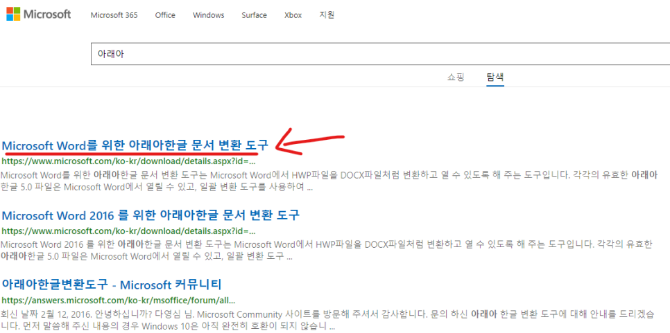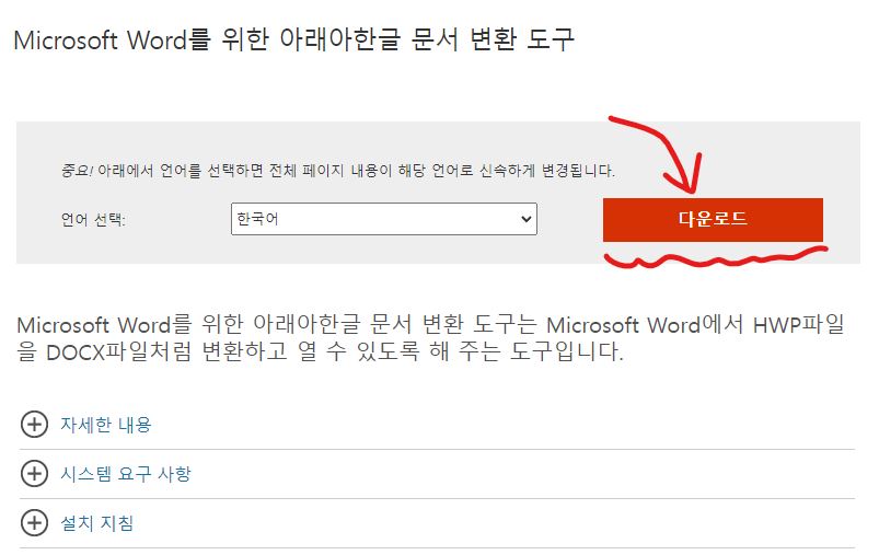 "Microsoft Word를 위한 아래아한글 문서 변환 도구"를 클릭해주자.