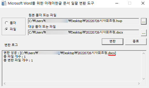 알아서 동일한 폴더에 변환된 docx가 저장되도록 설정된다.